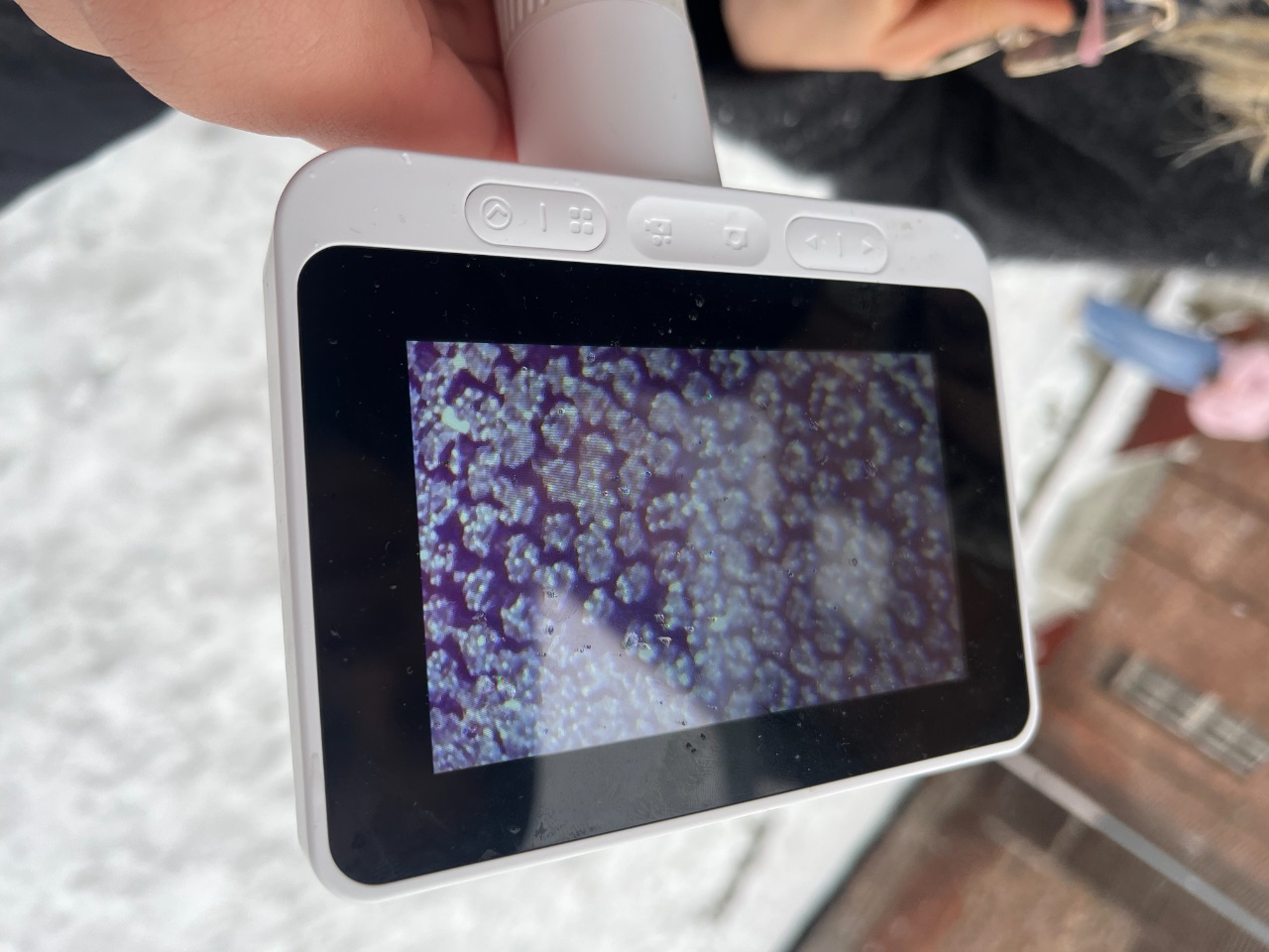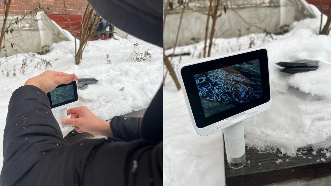 Pod mikroskopem obserwowaliśmy, jak wygląda śnieg z bliska i jak szybko się topi. Sprawdziliśmy też, czy śnieg rzeczywiście jest biały – i okazało się, że to tylko złudzenie optyczne. Rozmawialiśmy o stanach skupienia, o tym, jak powstają płatki śniegu oraz od czego zależy ich kształt i wielkość.