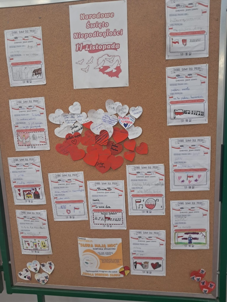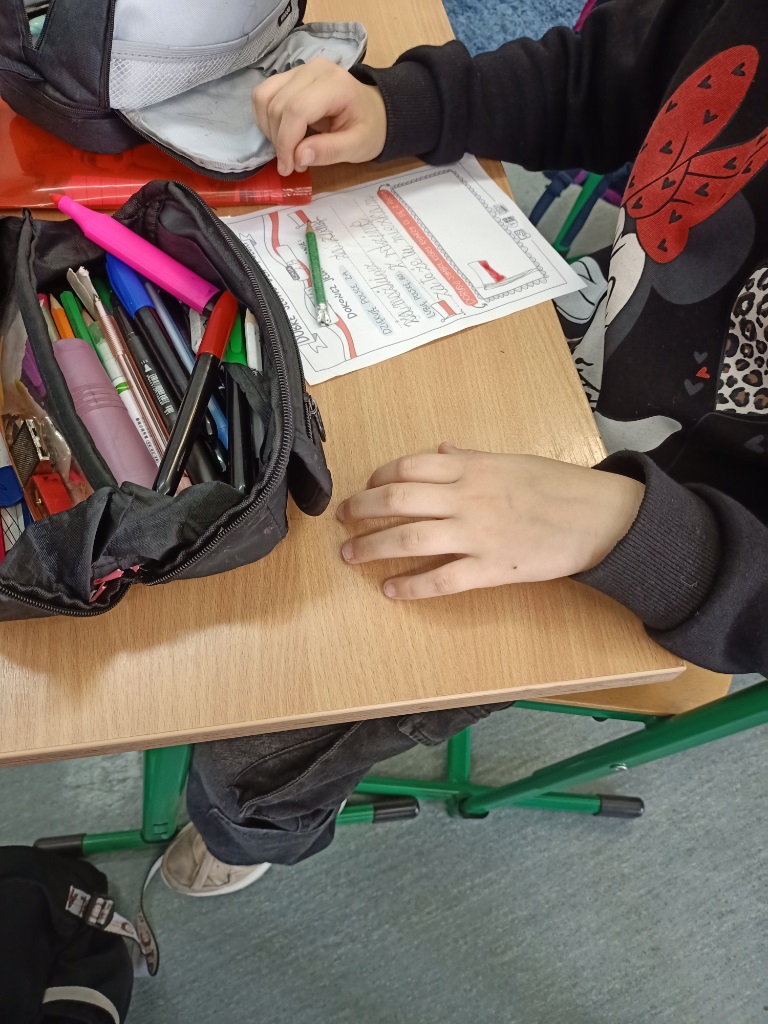Dzieci z zaangażowaniem napisały “dobre słowo dla Polski” i “za co ją lubią” oraz narysowały z czym kojarzy się im Polska. Na zakończenie uczniowie otrzymali białe i czerwone serduszko na których napisali dobre słowo dla siebie, bo Polskę tworzy każdy z nas.