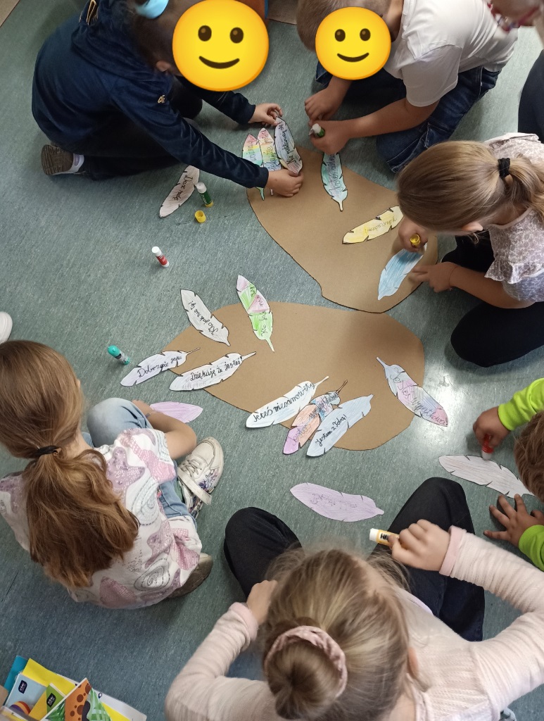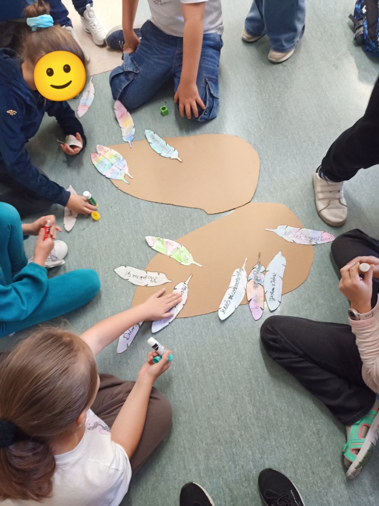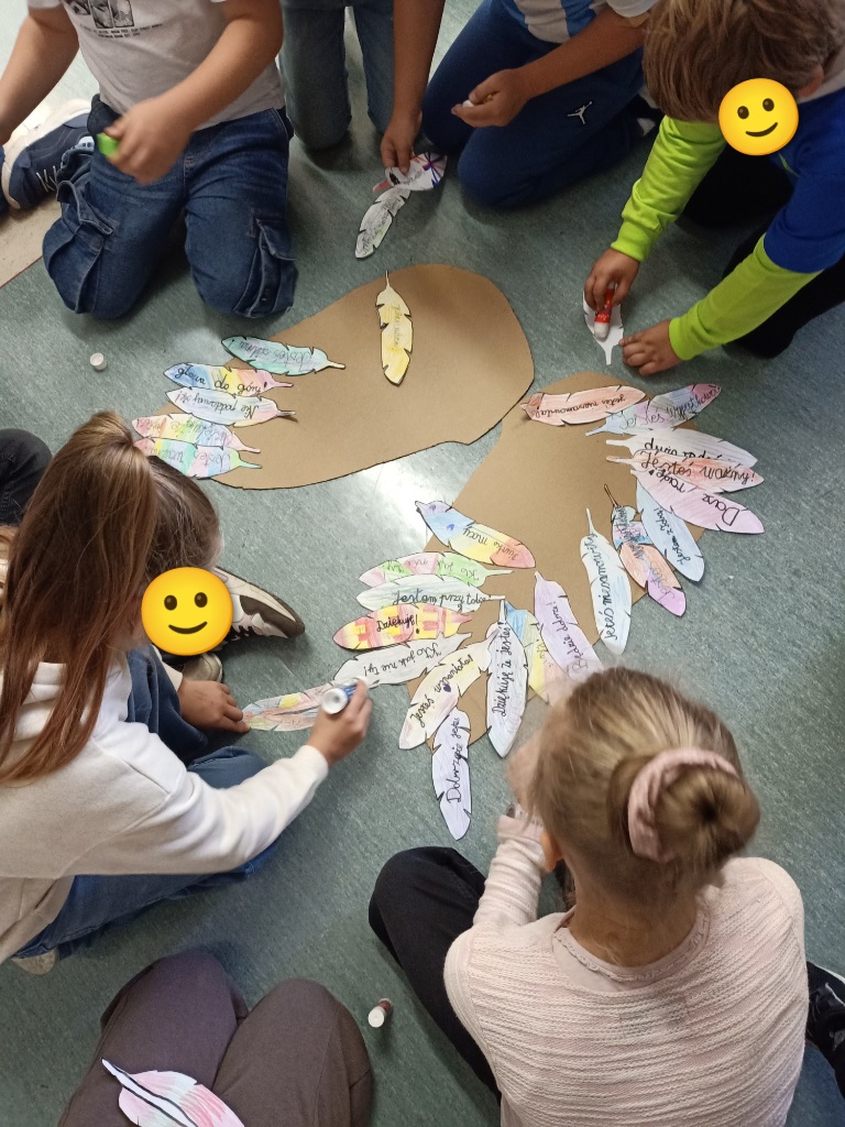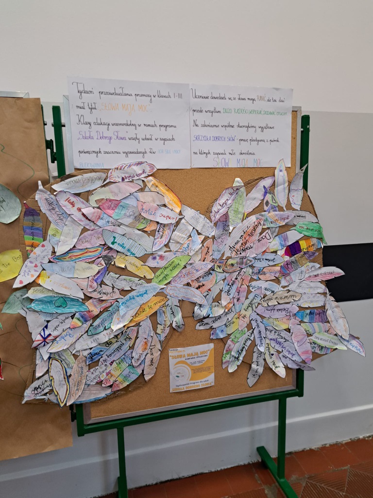 Klasy edukacji wczesnoszkolnej w ramach programu „Szkoła Dobrego Słowa” wzięły udział w zajęciach poświęconych znaczeniu wypowiadanych słów – ich sile i mocy budowania. Uczniowie dowiedzieli się, że słowa mogą ranić, ale też dać przede wszystkim dużo radości, wspierać, dodawać otuchy. Na zakończenie wspólnie wykonały wyjątkowe ”skrzydła dobrych słów” - pracę plastyczną z piórek na których napisali miłe określenia.