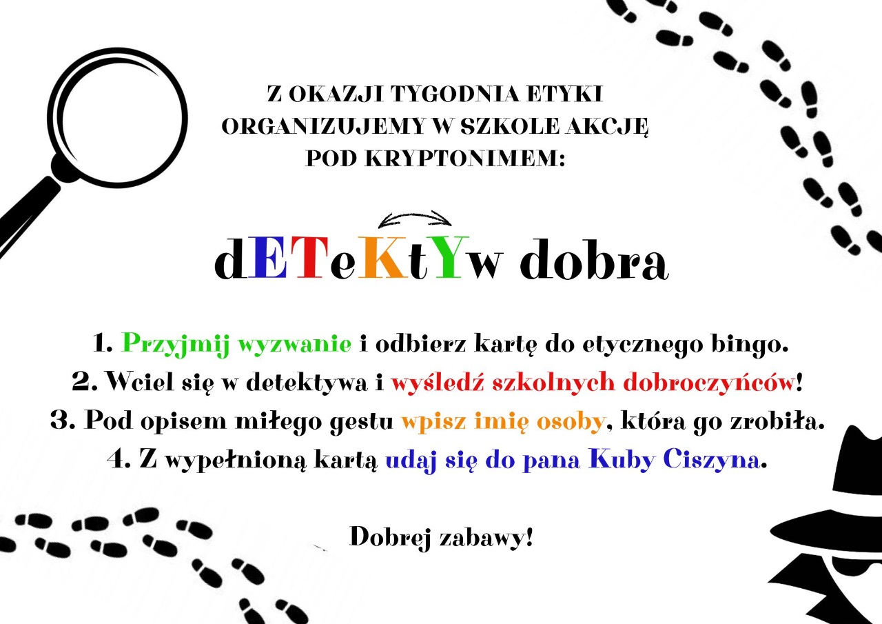 Z okazji tygodnia etyki zapraszamy całą społeczność szkolną do udziału w wyjątkowej zabawie – etycznym bingo! W dniach 13–20 października trwać będzie tajna operacja pod kryptonimem: dETeKtYw dobra.